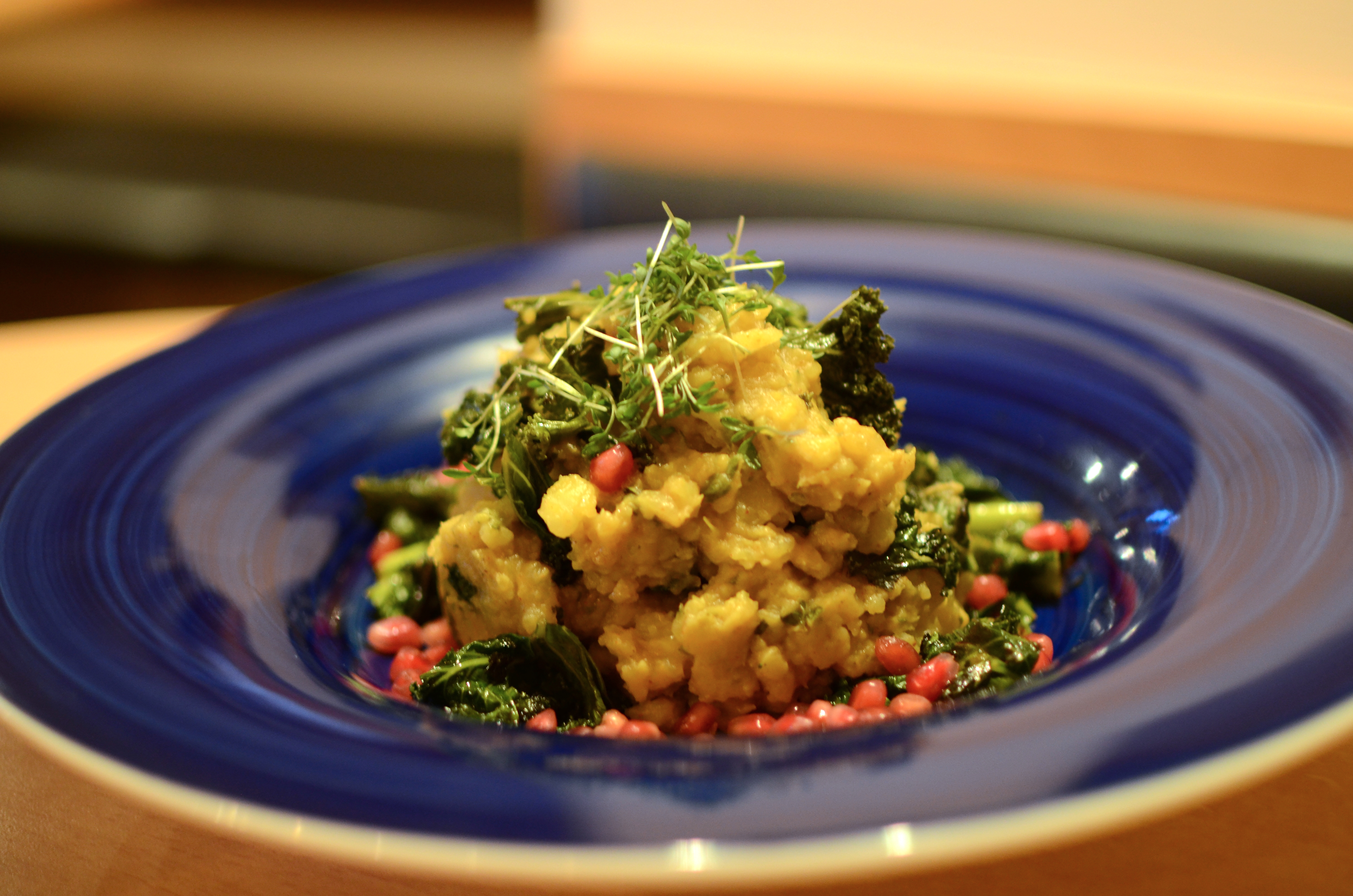 Currykartoffelstampf mit Grünkohl, frischen Kräutern und Granatapfelkernen (vegan oder vegetarisch)