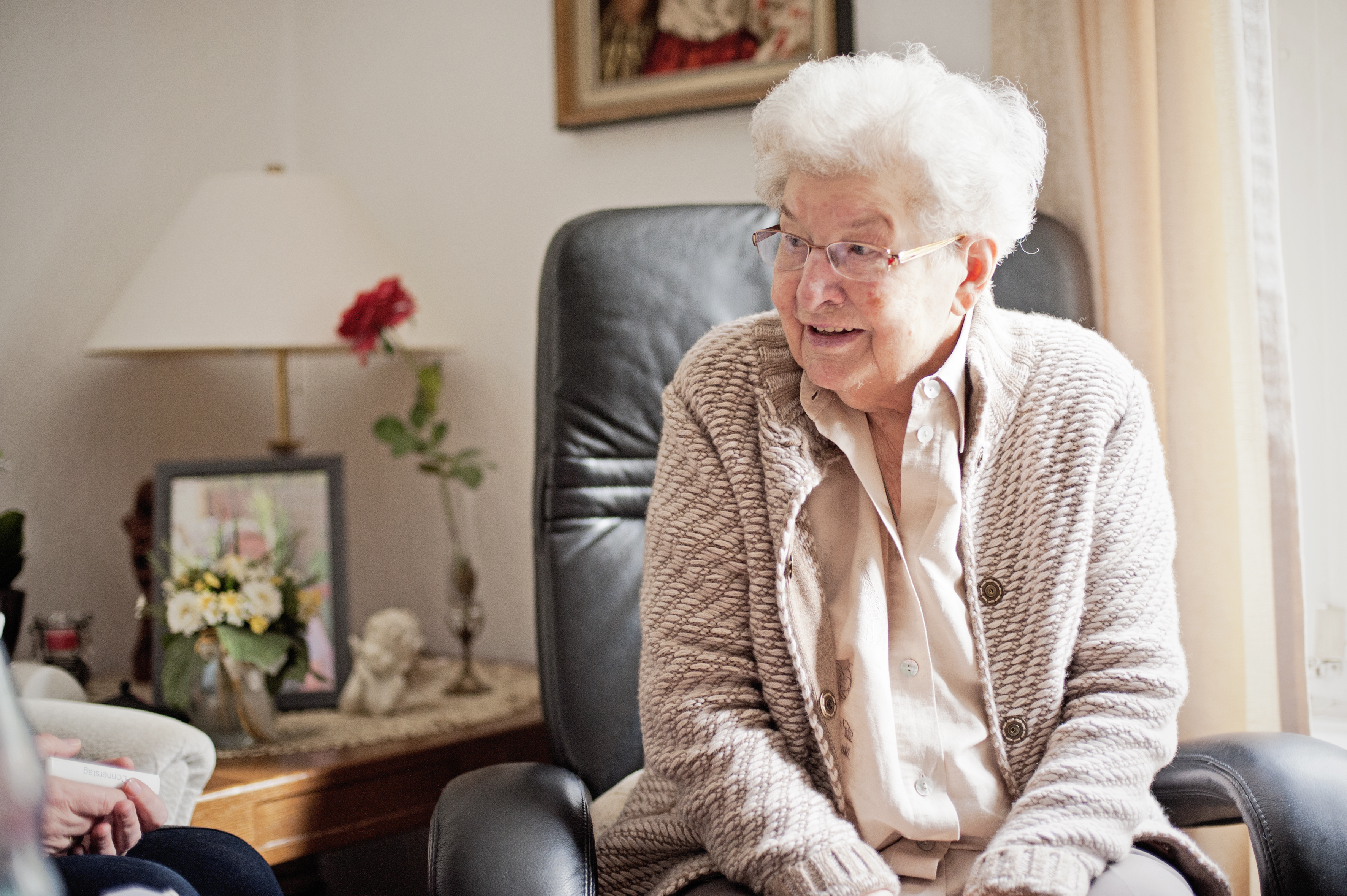 Genau das ist es auch, was den L&L Pflegedienst so besonders macht. Neben der Grundpflege wie Mobilisation oder Ernährung, der medizinischen Behandlungspflege wie dem Wechsel von Verbänden oder der hauswirtschaftlichen Versorgung mit Einkauf und Begleitservice nimmt sich das Team wirklich Zeit für die Senioren – damit diese auch wirklich „zuhause leben“ können. „Wir bemühen uns, möglichst nah dran an den Menschen zu sein, die unsere Hilfe brauchen und die Pflege individuell auf sie abzustimmen“, unterstreicht Lethen. Hierfür spricht auch, dass L&L der Blick für den momentanen Bedarf des alten Menschen wichtiger ist, als der Blick auf die Uhr. Da wird man fast ein kleiner Teil eines anderen Lebens“ , sagt Barbara Federmann lächelnd. Federmann, 44, Pflegedienstleiterin bei „L&L “ , sitzt gerade neben ihrer Kundin Josefine Reykers in deren Wohnzimmer auf dem Sofa. Zuerst hat Federmann die Seniorin gewaschen und fein gemacht für den Tag, dann hat sie kurz mit Reykers über die Insulinspritzen gesprochen, die sich die Seniorin täglich setzen muss. Und dann kam auch schon der wichtigste, der außergewöhnlichste Teil der täglichen Pflege: Reykers hat erzählt, was ihr heute durch den Kopf geht, was sie heute so bewegt. Und ihre Pflegerin hat zugehört.